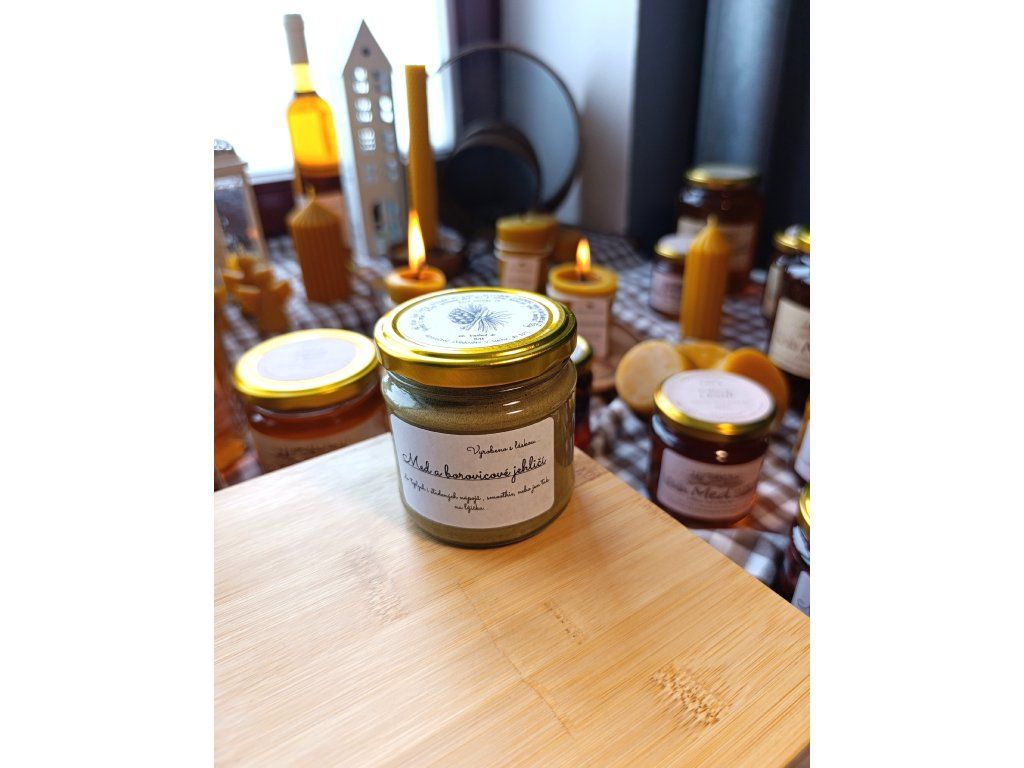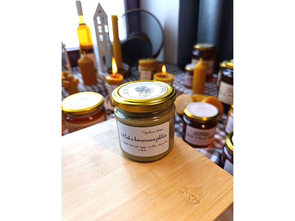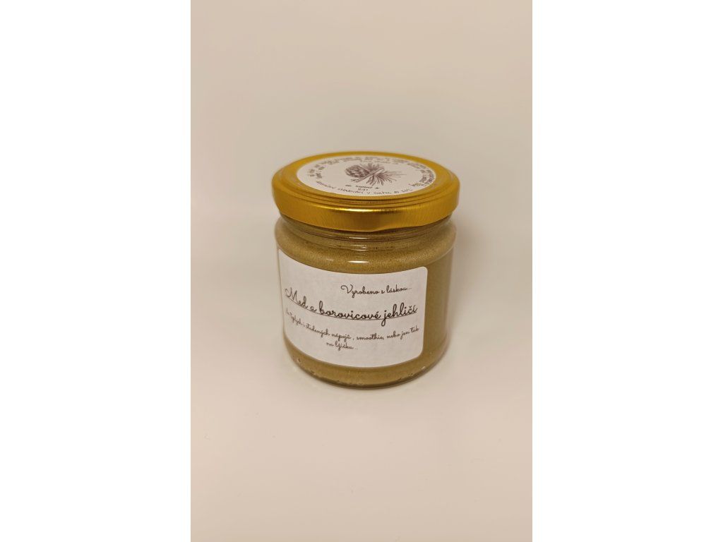 Med s bio borovicovým jehličím spojuje jemnou sladkost pastovaného medu se svěžím, lehce pryskyřičným aroma mladého jehličí. Vzniká spojením 95 % medu a 5 % jemně mletého bio borovicového jehličí.