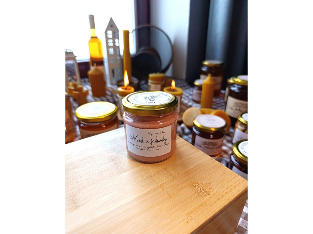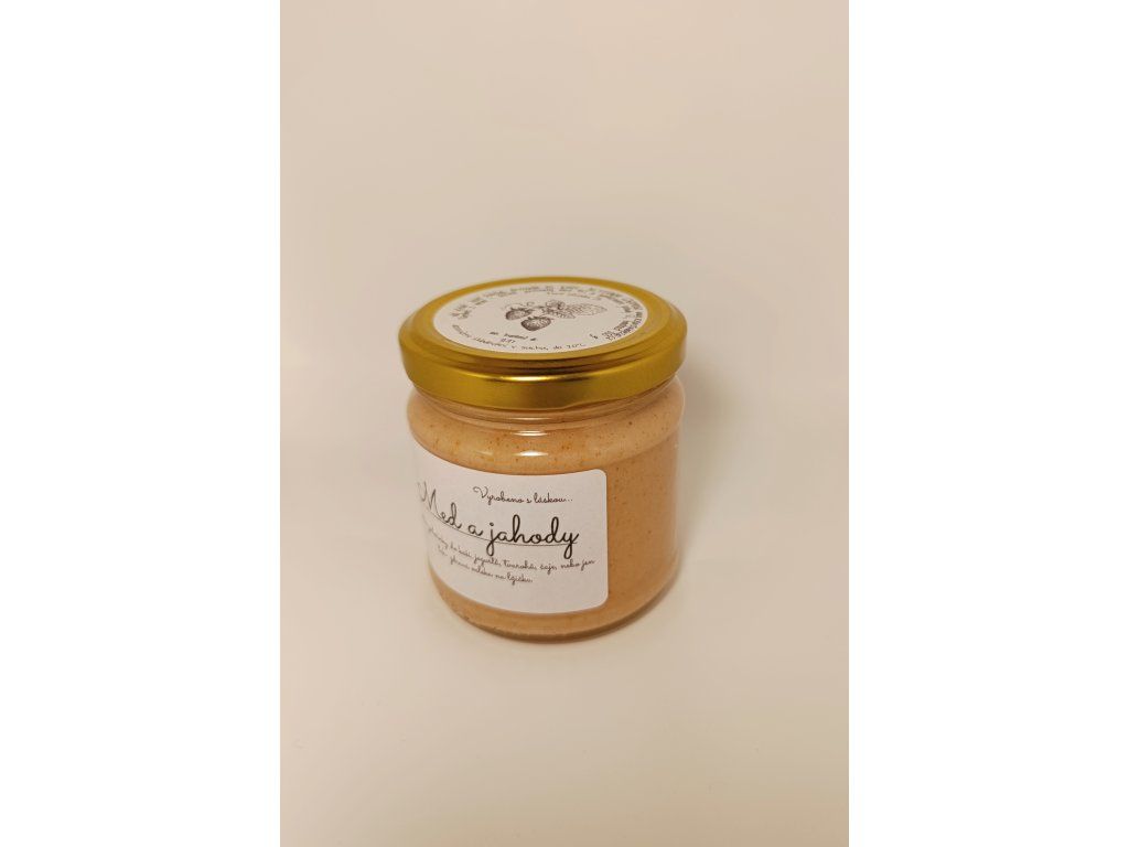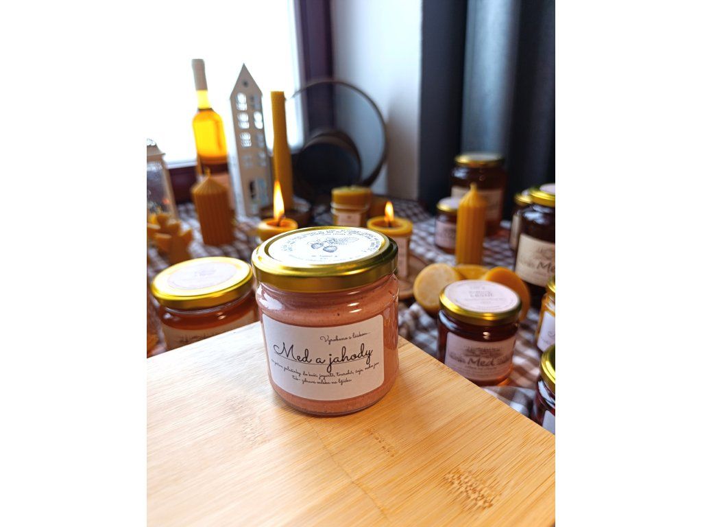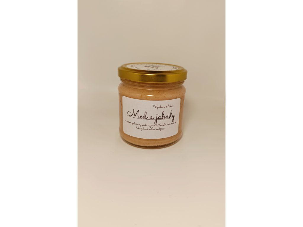 Med s jahodami vzniká spojením našeho pastovaného medu a lyofilizovaných jahod -sušených mrazem. Základem je 95 % medu doplněného o 5 % ovoce, které si díky šetrnému zpracování zachovává svou plnou chuť, barvu i aroma.