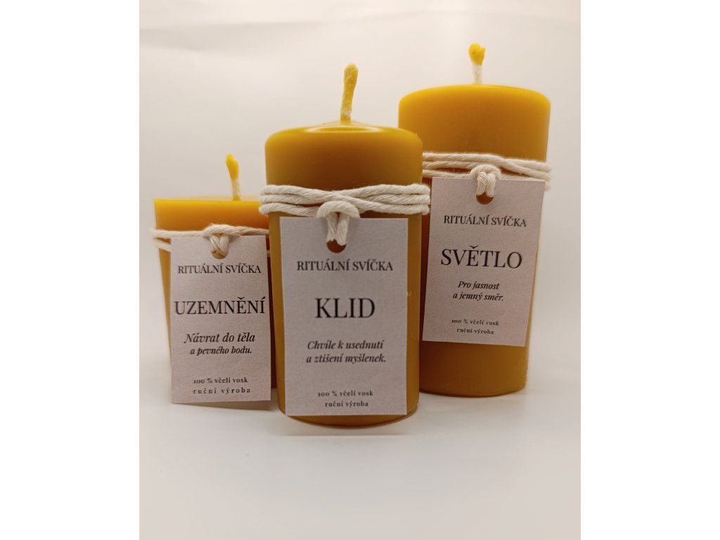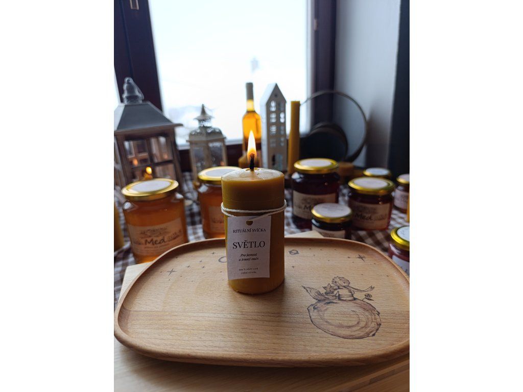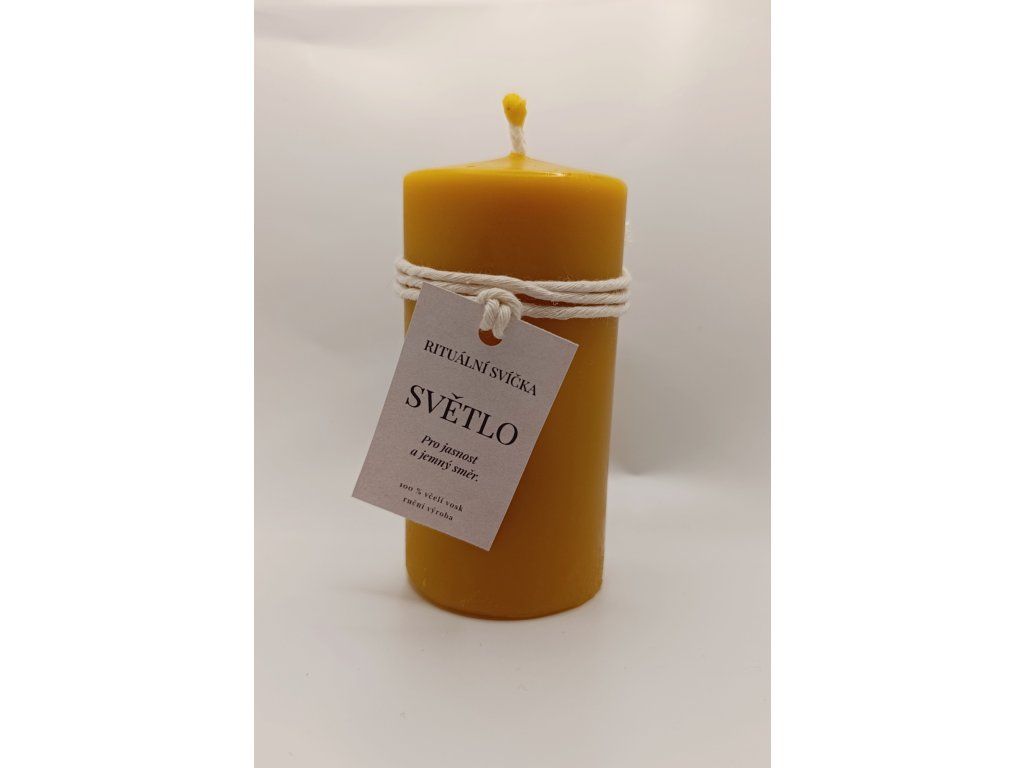 Rituální svíčka SVĚTLO je ručně odlévaná ze 100% včelího vosku, bez spěchu a bez zásahů. Vyšší tvar a přirozený zlatý odstín podtrhují pocit lehkosti a otevřenosti.