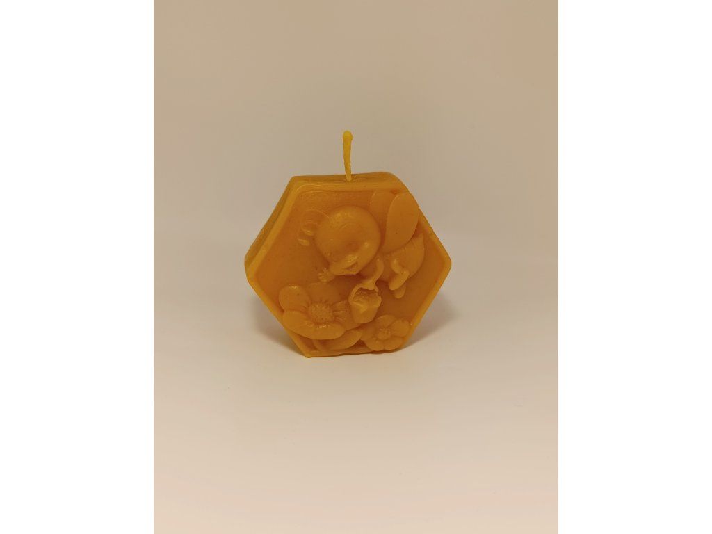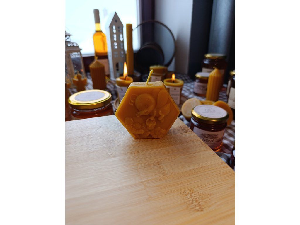 Ručně odlévaná svíčka z čistého včelího vosku s plastickým motivem včelky mezi květinami. Šestiúhelníkový tvar připomíná včelí plást a přirozeně podtrhuje její spojení s úlem.
