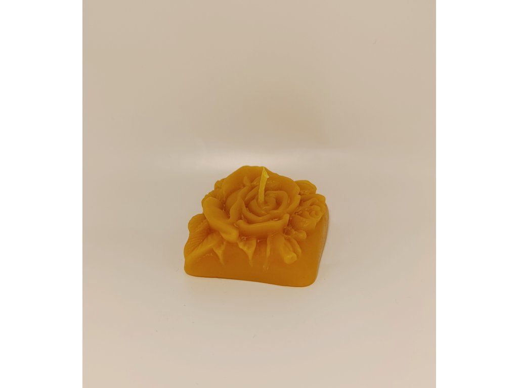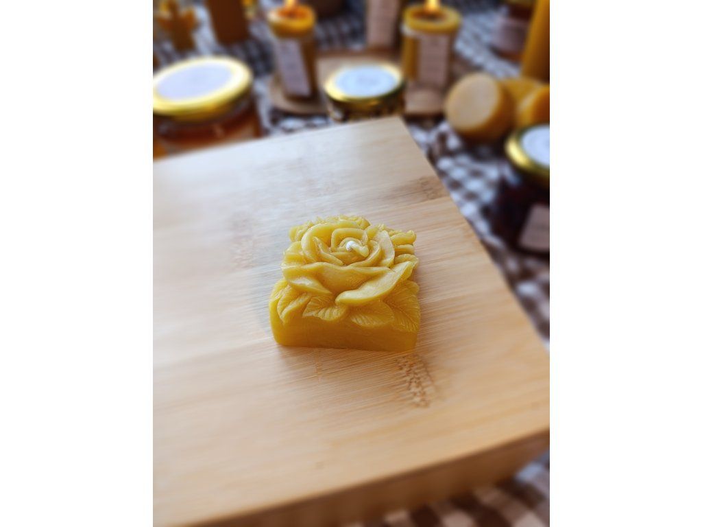 Mini svíčka ve tvaru rozkvetlé růže je vyrobena ze 100 % včelího vosku z našich úlů.